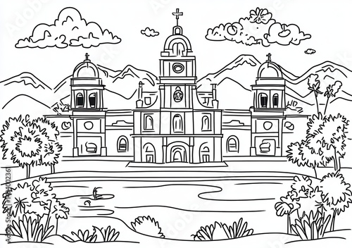 Fototapeta premium ILLUSTRATION EN NOIR ET BLANC D'UN GRAND BÂTIMENT RELIGIEUX DANS UN PAYSAGE MONTAGNEUX