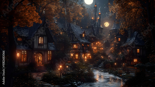 © queen, Obraz premium Illustration - Fantasy Village Night River Autumn Forest Moonlit