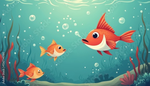 Fototapeta premium Illustration features fish serenading underwater friends with bubbles in whimsical aquatic setting. Playful marine life illustration with singing, friendship, fun. Ideal for children books,