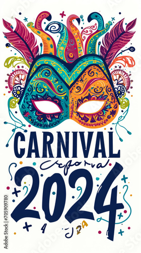Obraz premium Illustration Festive Masquerade Mask. White Background. Holiday Pageant and Mardi Gras Concept. Text Carnival 2024. Vertical Banner
