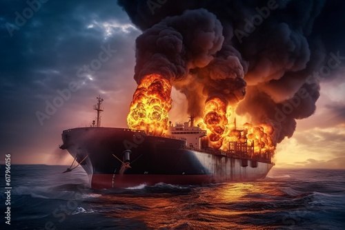 Fototapeta premium illustration,fire of a ship carrying liquefied gas,generative ai