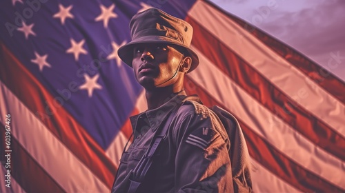 © Gelpi, Naklejka premium Illustration for Independence Day of the United States, July 4th - Soldier with American flag under a beautiful sun. Generative AI