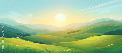 Obraz premium Illustration green fields, green hills, dawn landscape in bright blue sky,...