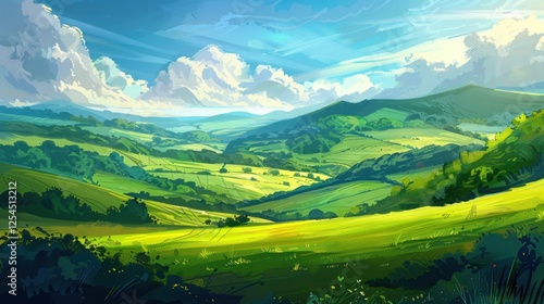 Fototapeta premium Illustration green fields or green hills landscape in bright blue sky...