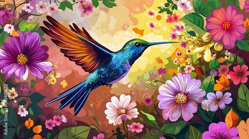 © GreenOptix, Naklejka premium illustration hummingbird and in the background many flowers, purple clay