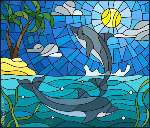 © Zagory, Obraz premium Illustration in stained glass style with a pair of dolphins on the background of water ,cloud, sky ,sun and Islands with palm trees