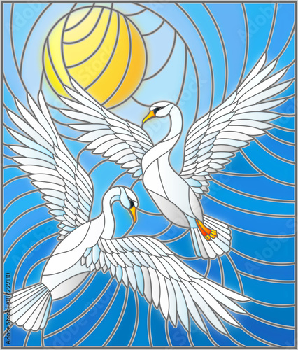 © Zagory, Fototapeta premium Illustration in stained glass style with a pair of swans on the background of the daytime sky and clouds