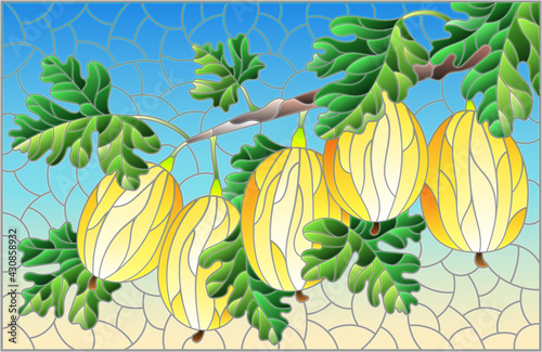 © Zagory, Fototapeta premium Illustration in the style of a stained glass window with a branch of ripe yellow gooseberries, berries and leaves on a blue background