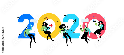 © ae, Naklejka premium Illustration inscription 2020 New Year in the office. Employees around the inscription. Image is isolated on white background. PR specialists celebrate. Banner of the New Year and Christmas.