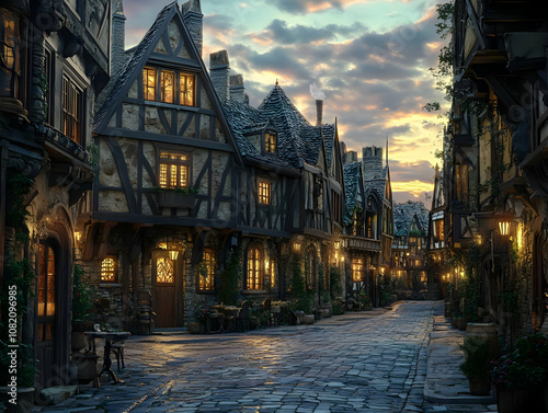 © queen, Fototapeta premium Illustration Medieval Town Street Dusk Fantasy Architecture