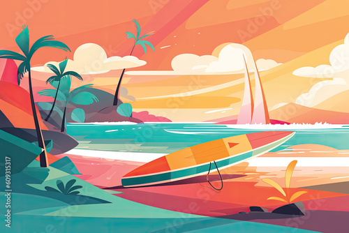 © Larva Head, Fototapeta premium Illustration of a beach with an umbrella and surfboards at sunset