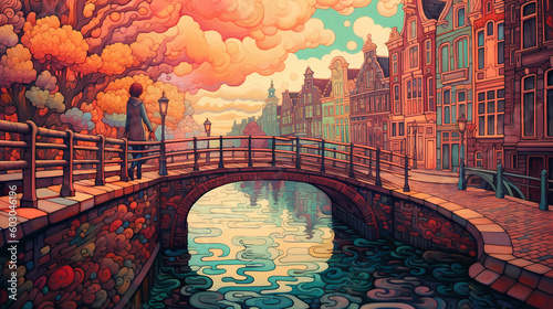 © Aleh Varanishcha, Fototapeta premium Illustration of a beautiful city view on the river