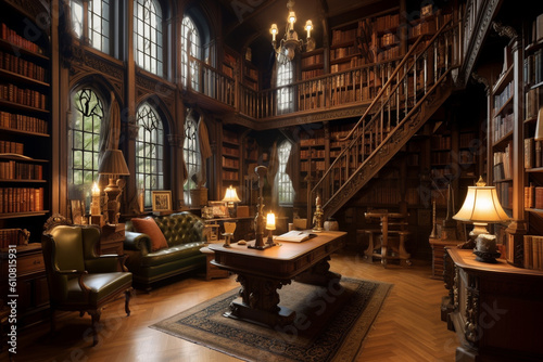 © Jeff Whyte, Fototapeta premium Illustration of a beautiful home library. Generative AI.