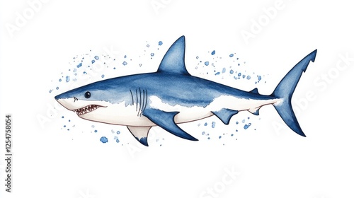 Naklejka premium Illustration of a blue shark swimming amidst splashes of watercolors,...