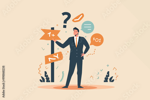 © Volodymyr, Obraz premium Illustration of a businessman at a crossroads pondering choices, symbolizing decision making and uncertainty.