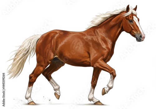 Naklejka premium Illustration of a chestnut horse with white mane and tail trotting on a white background art