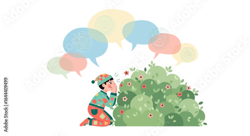 Obraz premium Illustration of a child whispering secrets behind a bush with speech bubbles...