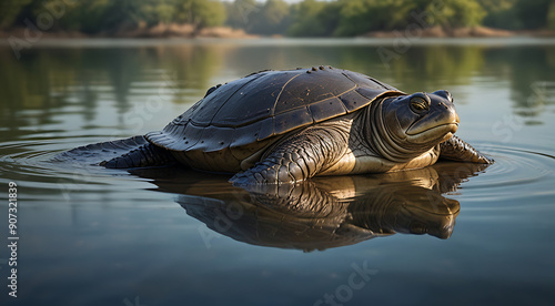 Fototapeta premium illustration of a critically endangered Yangtze giant softshell turtle in a serene river setting, highlighting its unique shell and the calm water with ample copy space.