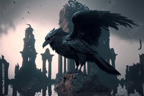 © Faiqdesign, Obraz premium Illustration of a crow with a building in the background, Ai generated