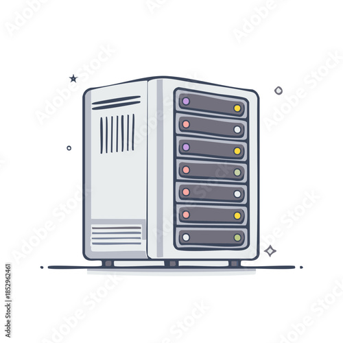 Fototapeta premium Illustration of a data server standing upright on a horizontal line shining with stars for network infrastructure purposes