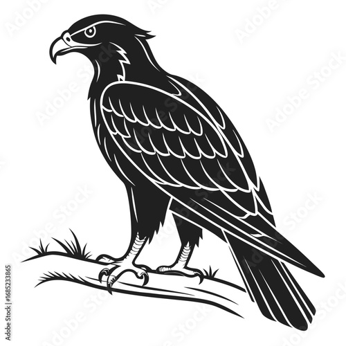 © mobil, Obraz premium Illustration of a detailed black and white eagle perched on a branch with grass in a vector format art created with generated ai