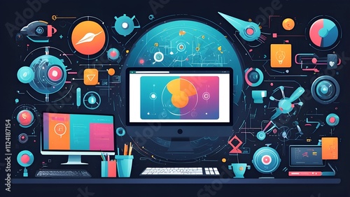 © MPSseven, Fototapeta premium Illustration of a digital video camera with technology and communication icons