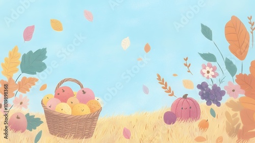 © glimsim, Fototapeta premium Illustration of a fall harvest scene with a basket of smiling apples, a pumpkin, grapes, and autumn leaves. Seasonal design for autumn and Thanksgiving themes.
