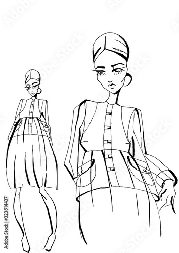 © lyubi, Fototapeta premium illustration of a fashionable girl in two positions. one approximate pose and full-length model. Fashion sketch of fashion design art . Fashion model hand drawn black ink lines pose isolated clothing