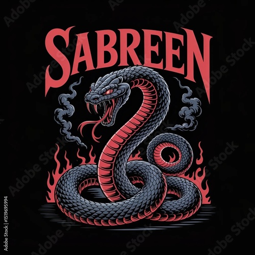 Obraz premium Illustration of a fierce cobra with the word sabreen in a bold decorative...