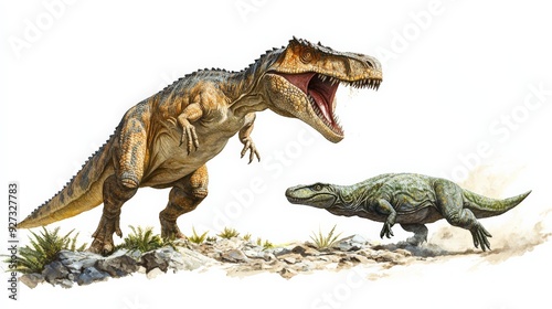 © arhendrix, Naklejka premium Illustration of a fierce T-Rex dinosaur chasing a smaller prehistoric creature in a natural habitat, showcasing prehistoric wildlife action.