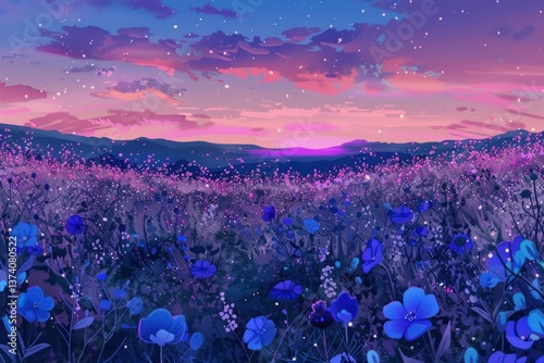 Fototapeta premium Illustration of a flower field purple backgrounds landscape.