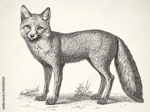 Fototapeta premium Illustration of a fox standing with a bushy tail and pointed ears on a light...