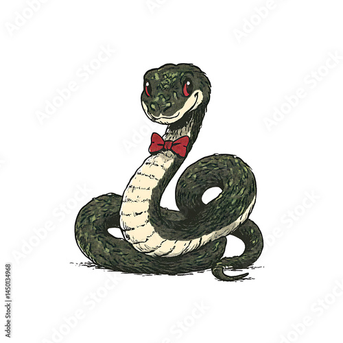 Obraz premium Illustration of a friendly green snake, wearing a red bow tie, coiled and smiling on a white background. Reptilian charm at its best!