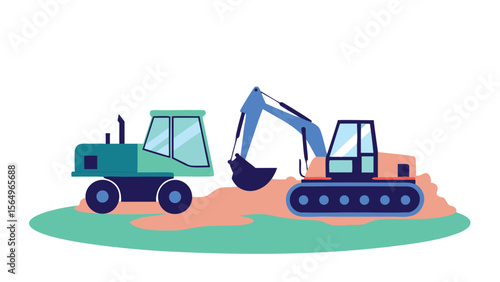© Vec_Hub, Fototapeta premium Illustration of a green tractor and an orange excavator on a green and brown ground with white background