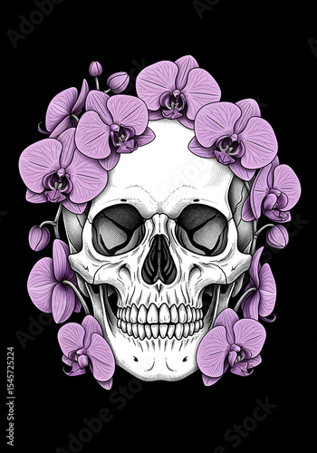 Fototapeta premium Illustration of a Human Skull Surrounded by Orchid Flowers