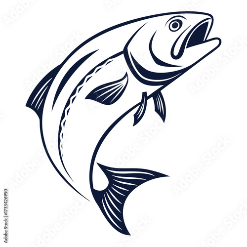 © adnan, Naklejka premium Illustration of a jumping fish with detailed fins and open mouth in black and white outline design style