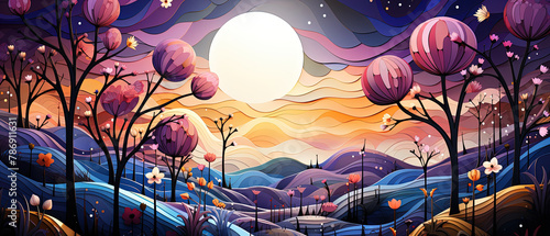 © Masum, Obraz premium illustration of a landscape with a river and trees at night