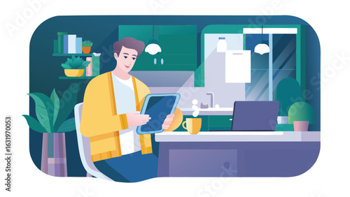 Obraz premium Illustration of a man sitting at a desk holding a tablet in a home office environment with plants and laptop