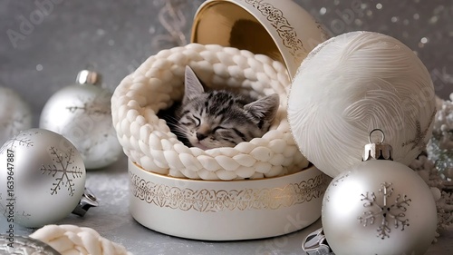 © Anna, Fototapeta premium Illustration of a New Year's holiday scene with a peacefully sleeping kitten on a white scarf placed in a box surrounded by large Christmas tree balls.