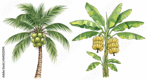 © Matt, Fototapeta premium Illustration of a pair of tropical trees with coconut and banana fruits.