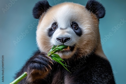 © Sanchai, Naklejka premium Illustration of a panda eating bamboo, designed with clean lines on a white background for a playful look