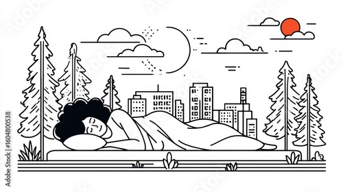 Naklejka premium Illustration of a person sleeping peacefully under a blanket, with a city...