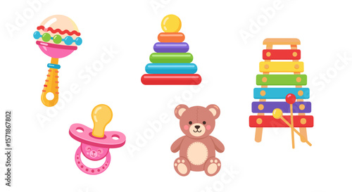 Fototapeta premium Illustration of a rattle, stacking rings toy, pacifier, teddy bear, and xylophone on white background