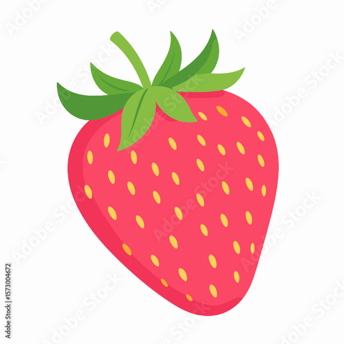 © bella, Fototapeta premium Illustration of a Ripe Red Strawberry with Green Leaves and Yellow Seeds on White Background Close Up