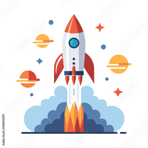 © Sadhin07, Fototapeta premium Illustration of a rocket launching into space with planets and stars isolated on white background startup concept