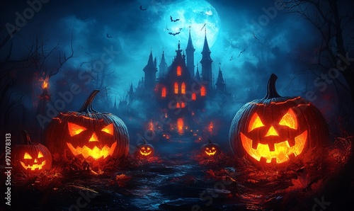 Fototapeta premium illustration of a scary halloween design with glowing pumpkins and castle