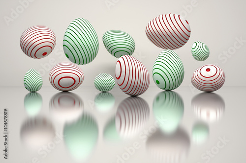 © dariaren, Fototapeta premium Illustration of a set of Easter eggs with red and green round grooves over the white reflective surface. Digitally generated image.