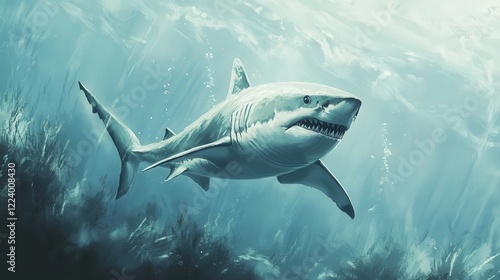 Fototapeta premium illustration of a shark in its natural underwater environment, highlighting its powerful build and elegant design against a white canvas