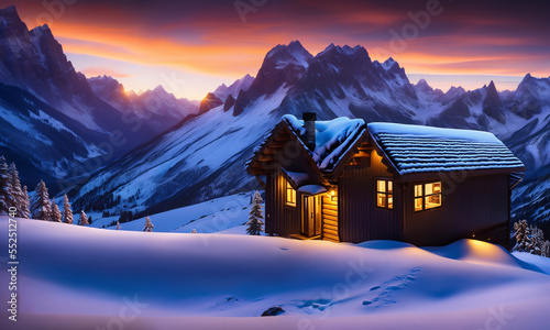 Fototapeta premium Illustration of a small cabin in the middle of a snowy mountain AI Generated
