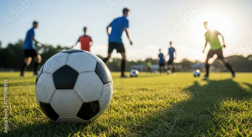 Fototapeta premium Illustration of a soccer ball on green grass with players in the background,...